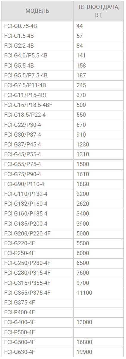 ТАБЛИЦА ДАННЫХ ПО ТЕПЛООТДАЧЕ ПРЕОБРАЗОВАТЕЛЕЙ ЧАСТОТЫ INSTART СЕРИИ FCI