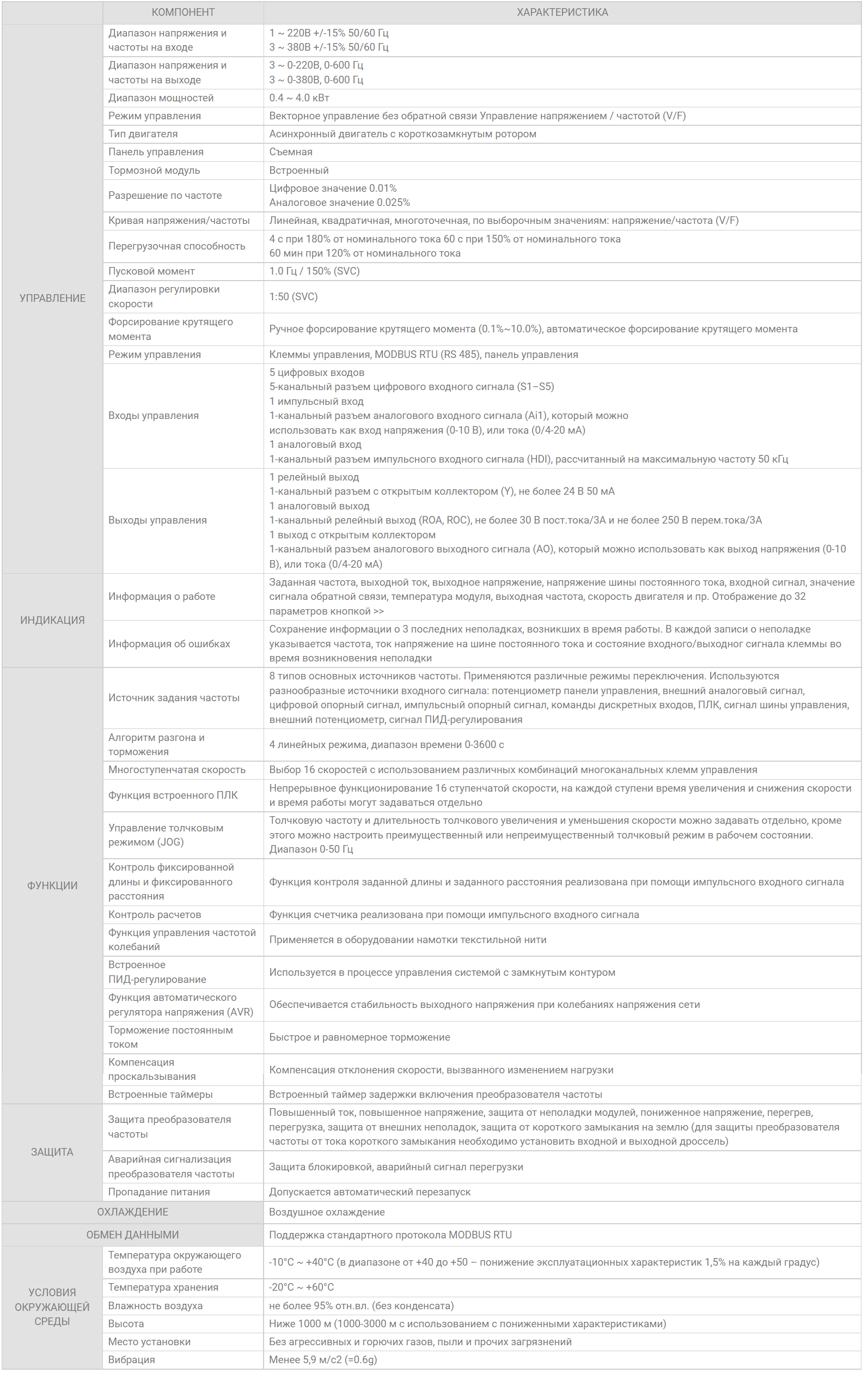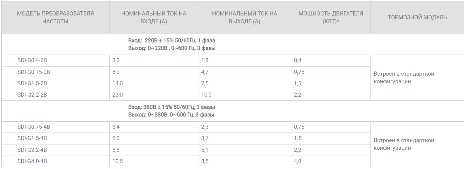 - Встроенный протокол MODBUS RTU (RS 485) IGBT модуль (кроме модели SDI–G4.0-4B)