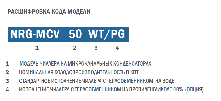 NRG-MCV – линейка чиллеров средней производительности на хладагенте R410A. Предназначены для установки на открытом воздухе и в помещении. Модельный ряд покрывает производительность от 50 до 830 квт. Характерной особенностью является использование высокоэффективных микроканальных конденсаторов, способных работать при высоком давлении. Применение нескольких компрессоров и контуров по хладагенту обеспечивает широкий диапазон производительности и высокую надежность.