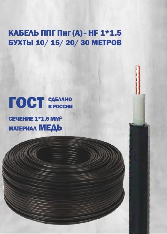 Безгалогенный круглый силовой кабель Кабель силовой ППГ-Пнг(A)-HF 1х1.5 мм2, 15м предназначен для стационарной прокладки внутри жилых, административных и производственных помещений.