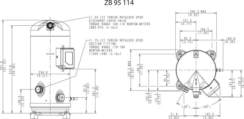 Спиральный холодильный компрессор Copeland Scroll ZB-95-KCE-TFD-551 - мощный компрессор используемый в среднетемпературных холодильных машинах. Характеристики компрессора позволяют использовать его как в однокомпрессорных агрегатах, так и в составе холодильных централей в коммерческом и промышленном холоде. Описание компрессора в исполнении 551: резьбовые патрубки под вентиль Rotalock на всасывание и нагнетание, смотровое стекло, патрубок для тандемизации, четыре монтажные опоры. Компрессор заправлен маслом POE и сконструирован для работы с фреонами R407C, R134a, R404A.