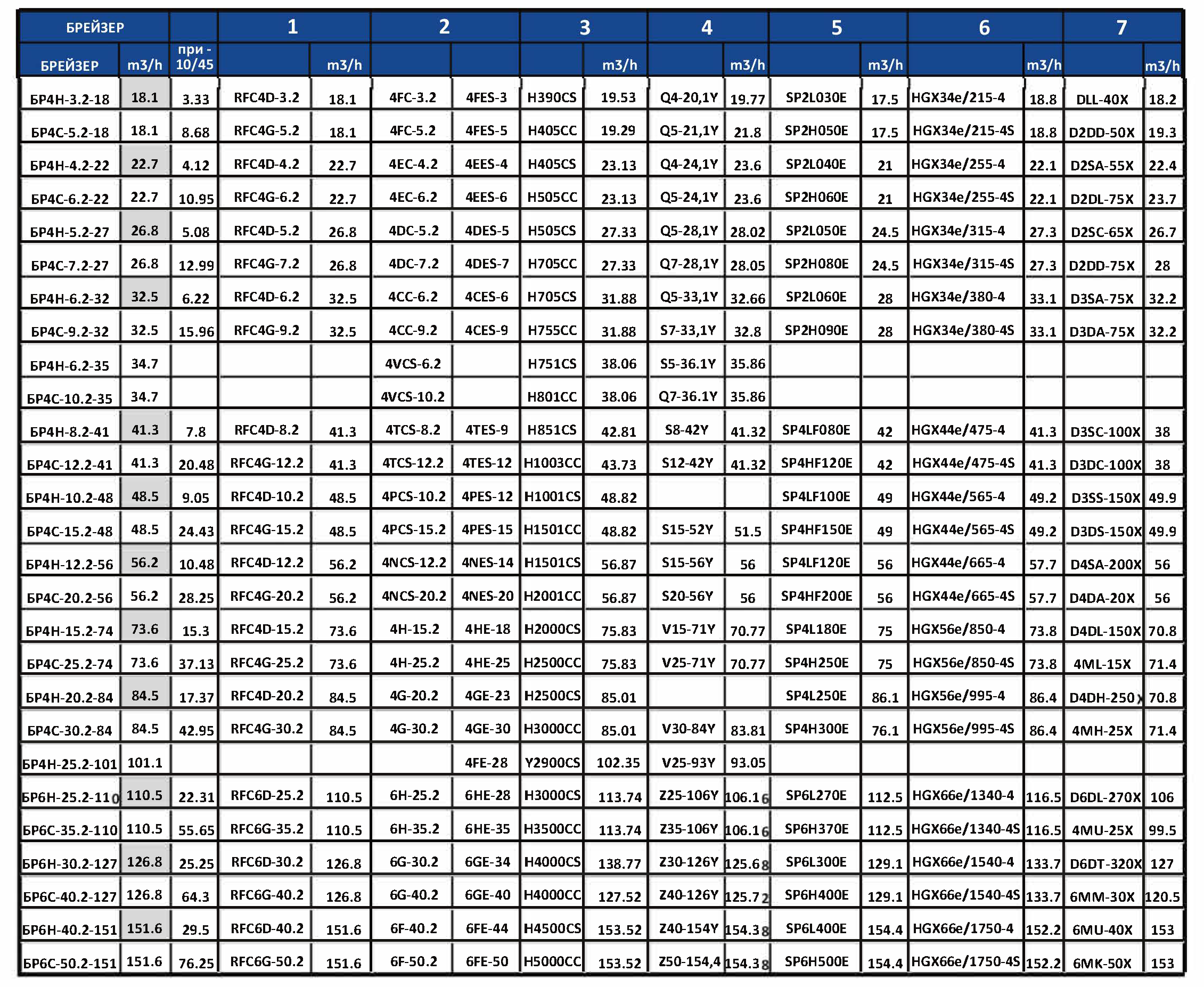 Dorin | Объемная пр-сть, м3/ч | Frascold | Объемная пр-сть, м3/ч | Daming | Объемная пр-сть, м3/ч | Брейзер | Объемная пр-сть, м3/ч |