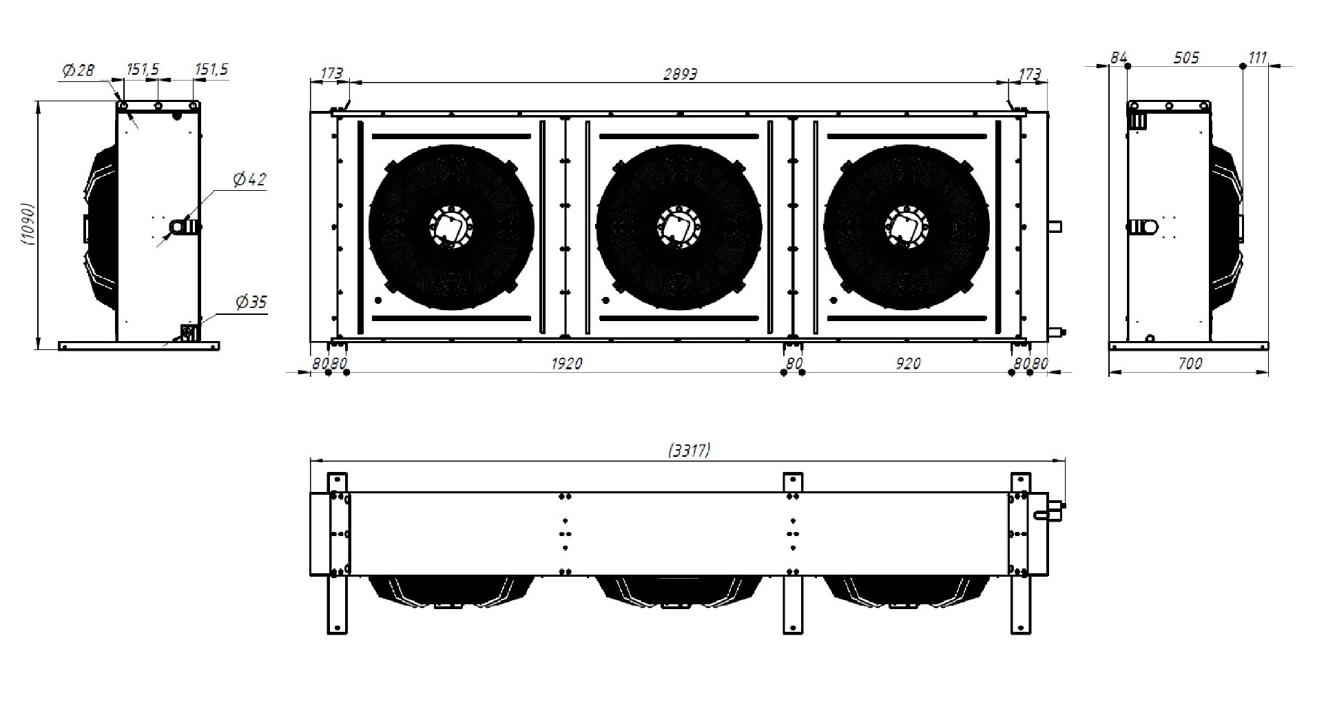 | Модель | Q* при ∆T=15K, кВт, | Q** при ∆T=10K, кВт, | S внешн, м2 | V внутр, дм3 | Вход х выход, мм | Вент., кол-во х Ø мм | Ток вент-ров, А | Скор., об/мин | ||
