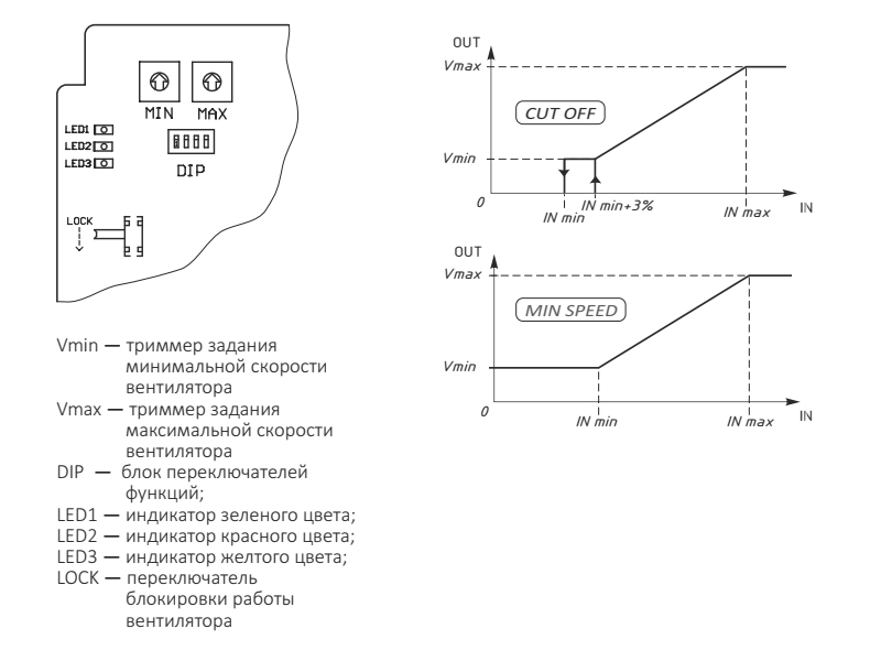 DIP-2 = 0. Режим CUT OFF. В этом режиме (см. рис.) скорость вращения вентилятора пропорциональна входному сигналу во всем диапазоне, от минимальной Vmin до максимальной Vmax скорости. Регулирование выключается, когда уровень входного сигнала достиг минимального значения INmin. Регулирование включается, когда уровень входного сигнала поднялся до значения INmin+3%. DIP-2 = on. Режим MIN SPEED. В этом режиме (см. рис.) скорость вращения вентилятора пропорциональна входному сигналу во всем диапазоне, от минимальной Vmin до максимальной Vmax скорости. При снижении входного сигнала до минимального значения INmin и ниже регулирование не выключается, а продолжает работать на скорости Vmin.