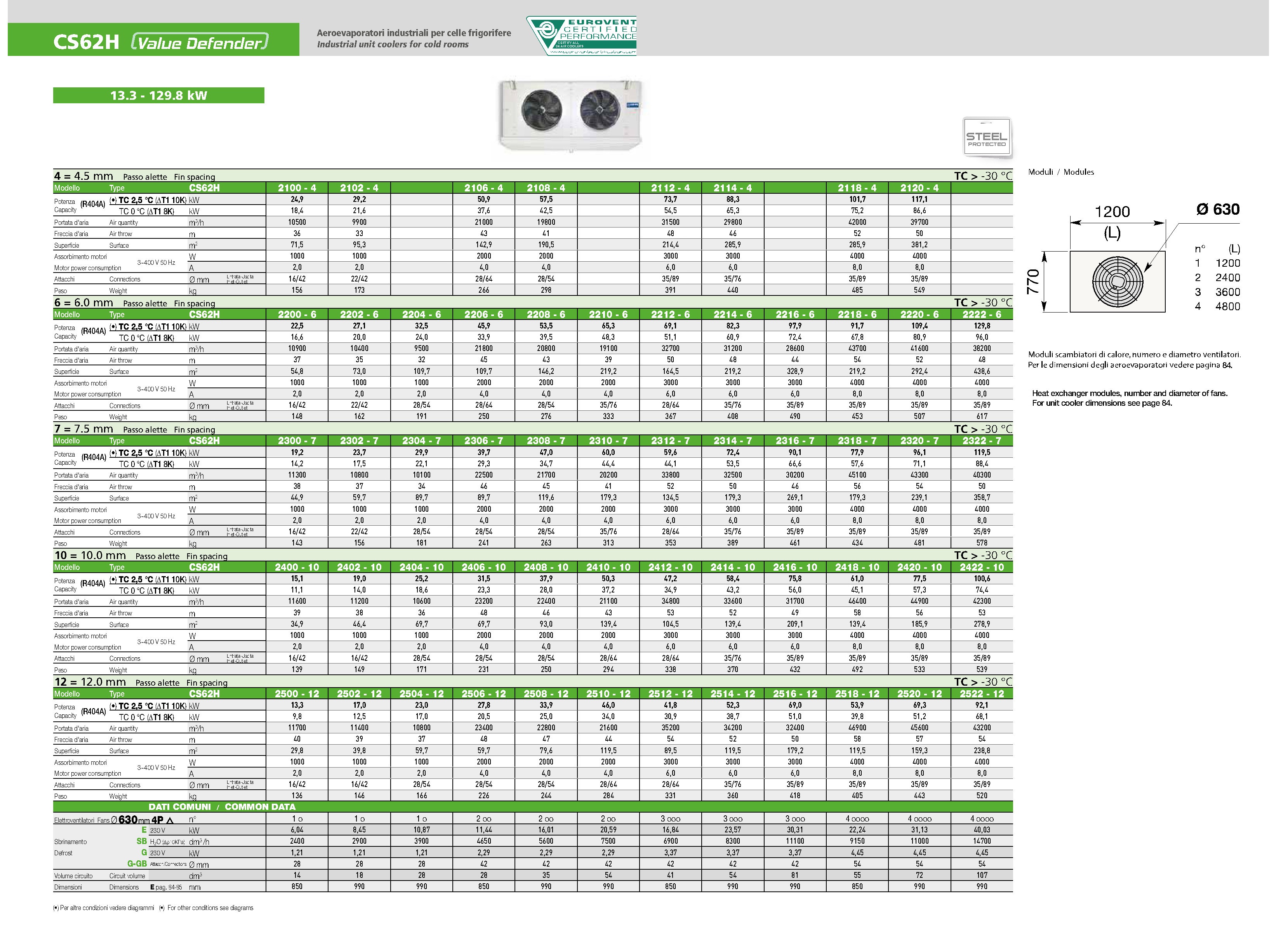 Теплообменник CHS, используемый новые ламели типа Turbofin 3 и трубы расположенные в шахматном порядке, характеризуется оптимальным отношением между вторичной поверхностью ламелей и первичной поверхностью труб, что позволяет достигнуть высоких результатов производительности. Алюминиевые пластины имеют оптимальную конфигурацию для применения в промышленных холодильных системах.