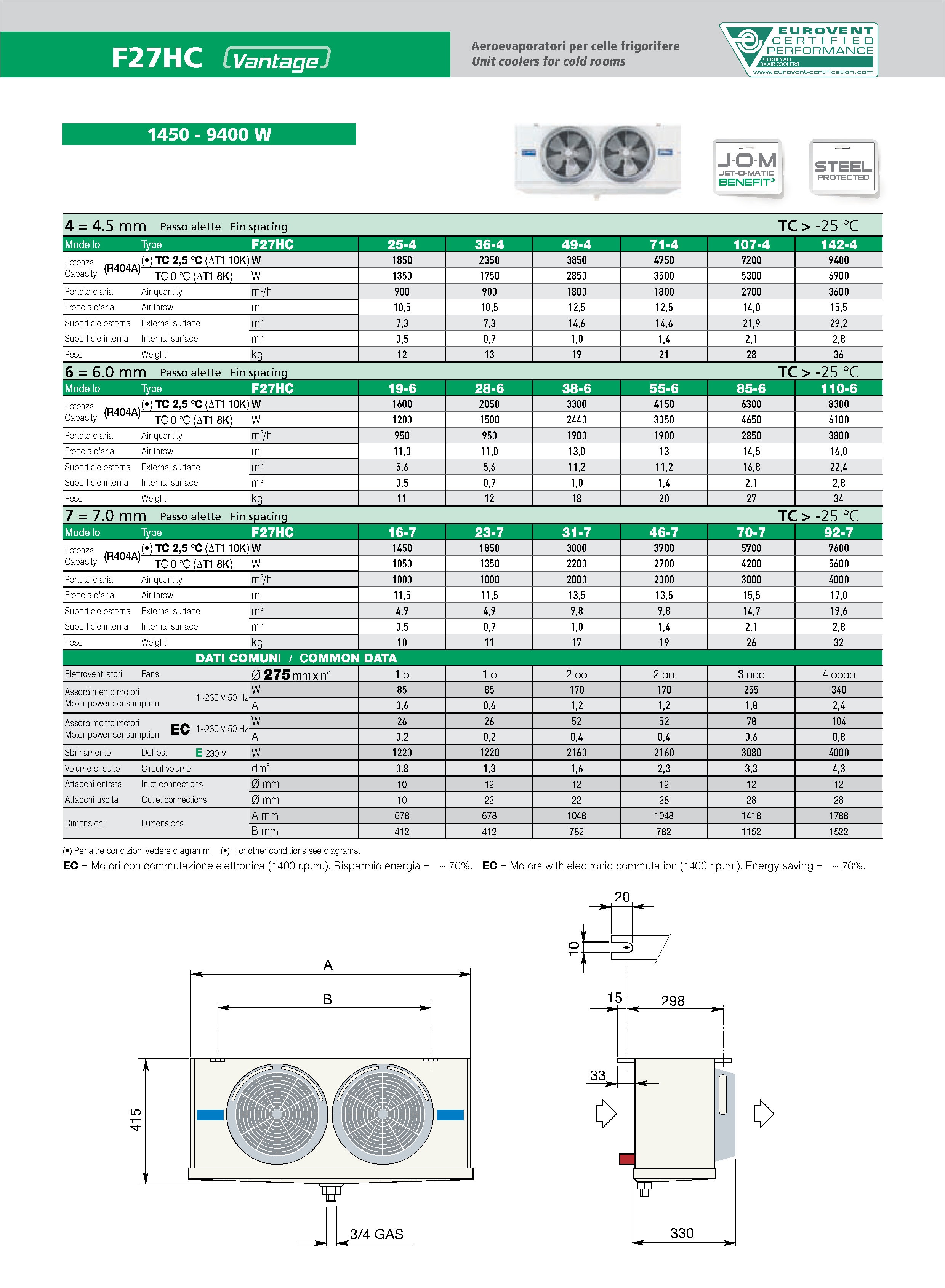 Воздухоохладитель LU-VE F27HC142E4 обладает холодопроизводительностью 9.4 кВт при заданных условиях. Его корпус изготовлен из оцинкованной стали с покрытием Epoxy-Polyester и имеет сертификат "Евровент". Оребрение этого воздухоохладителя имеет шаг 4.5 мм. Теплообменник Turbocoil обеспечивает высокую эффективность благодаря применению медных труб и специальных пластин оребрения. Устройство оснащено тремя вентиляторами диаметром 275 мм, работающими от электросети 220В/50Гц и потребляющими 0.085 кВт каждый. Система оттайки осуществляется электрически, с напряжением питания 220В/50Гц и потребляемой мощностью 4 кВт.